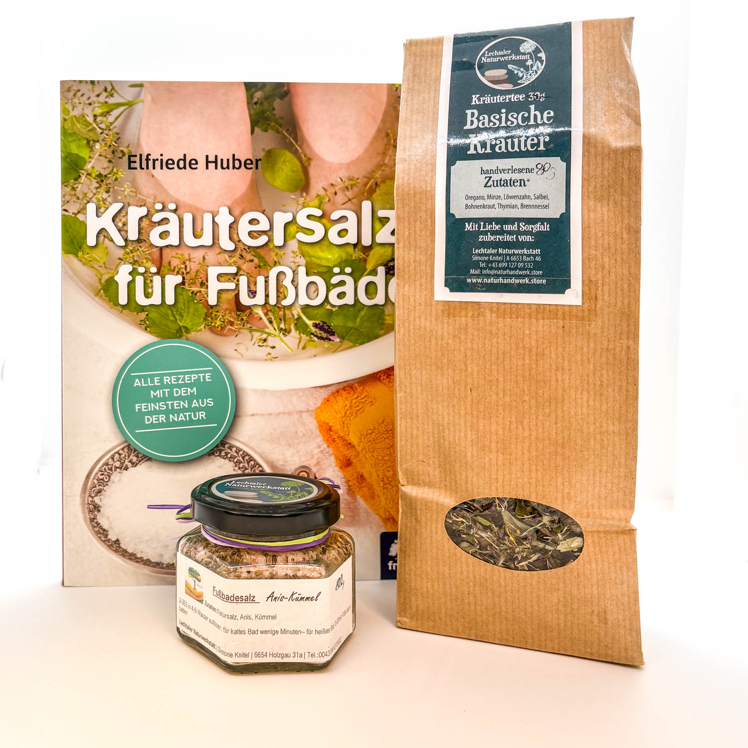 bestehend aus: dem Buch „Kräutersalze für Fußbäder“, einem Fußbadesalz von Elfriede Huber und meinem Kräutertee „Basische Kräuter“ 80g