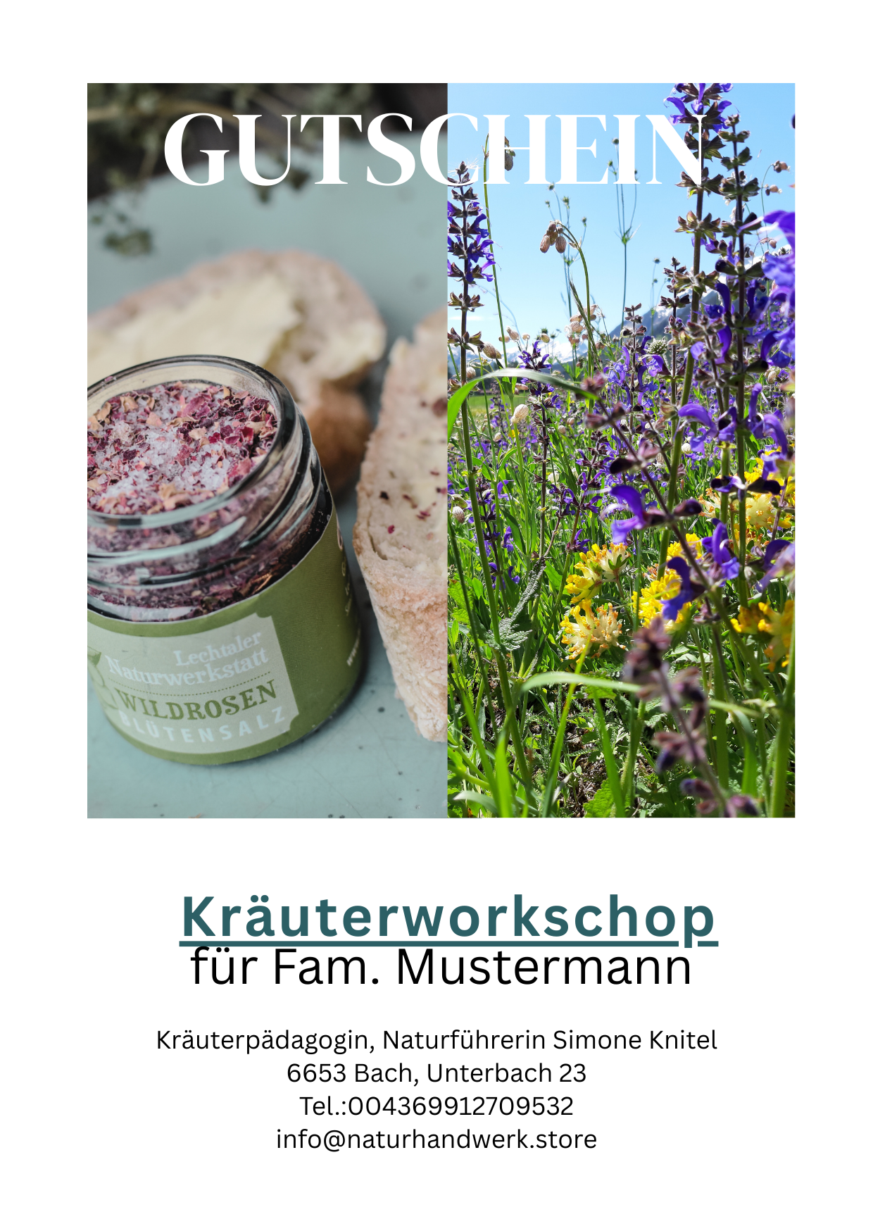 Gutschein für 1 Kind 7-15 Jahre in Begleitung eines teilnehmenden Erwachsenen 2-3h Kräuterworkshop mit Wanderung, inkl. Skriptum und Material